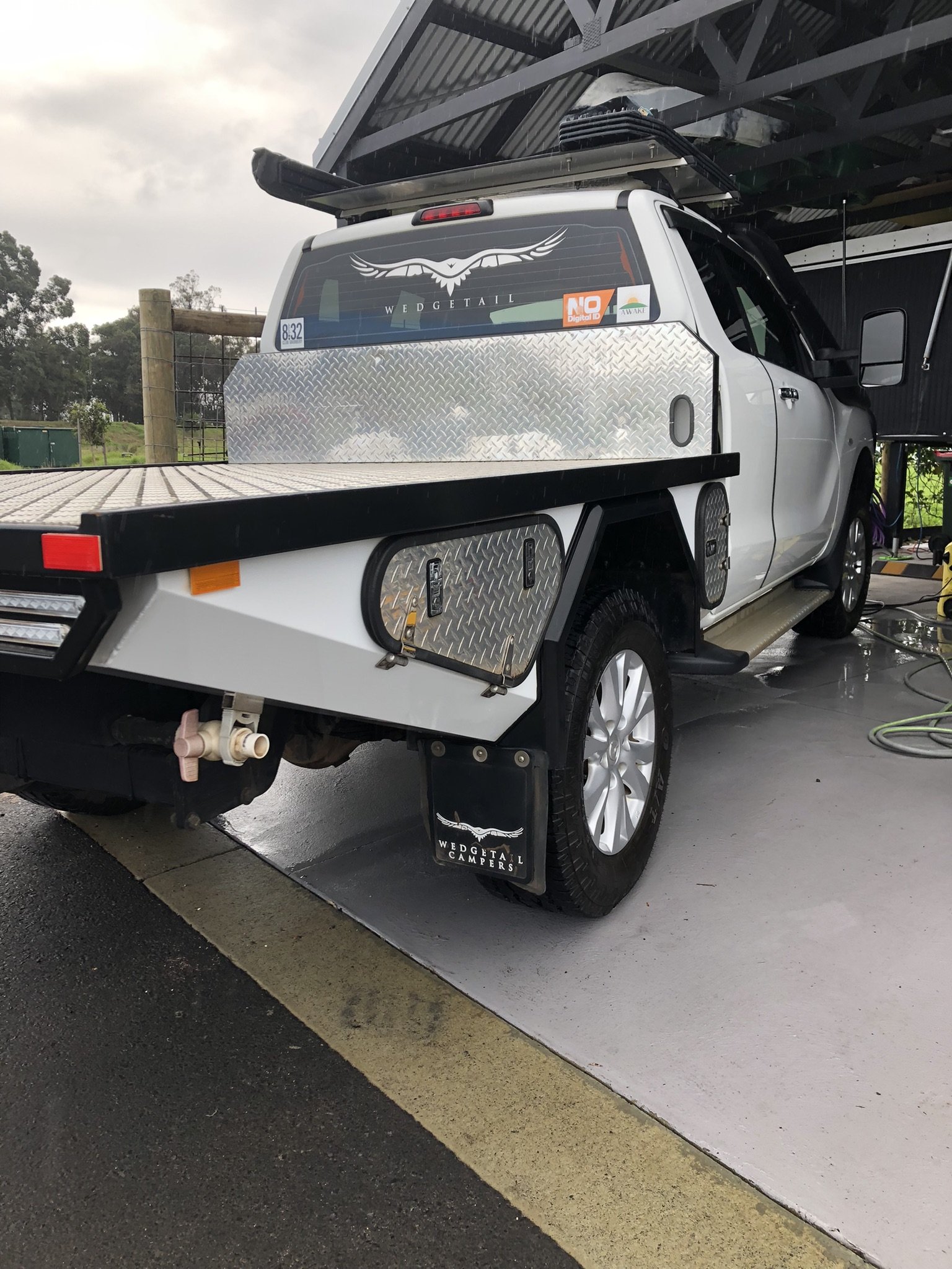 After a few weeks chasing the winter sun up north, the BT-50 was in need of a proper clean. The exterior was treated to a full wash, starting with a wheel clean, followed by a pre-rinse and contact wash, before finishing with the application of a protective sealant. Inside, the cabin received a thorough vacuum, with the seats and carpets dry shampooed to lift out the dirt. All surfaces were cleaned and finished with a vinyl protectant, and the windows polished inside and out.